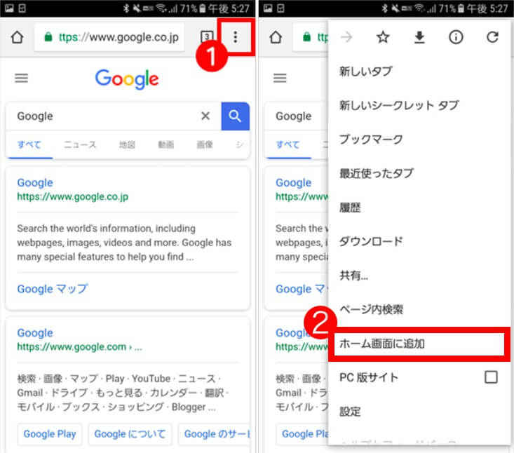※ギャラクシーなどの機種によっては、ホーム画面に追加したいページを開き、端末のメニューボタン(液晶画面の外にある)から直接追加できるものもあります。