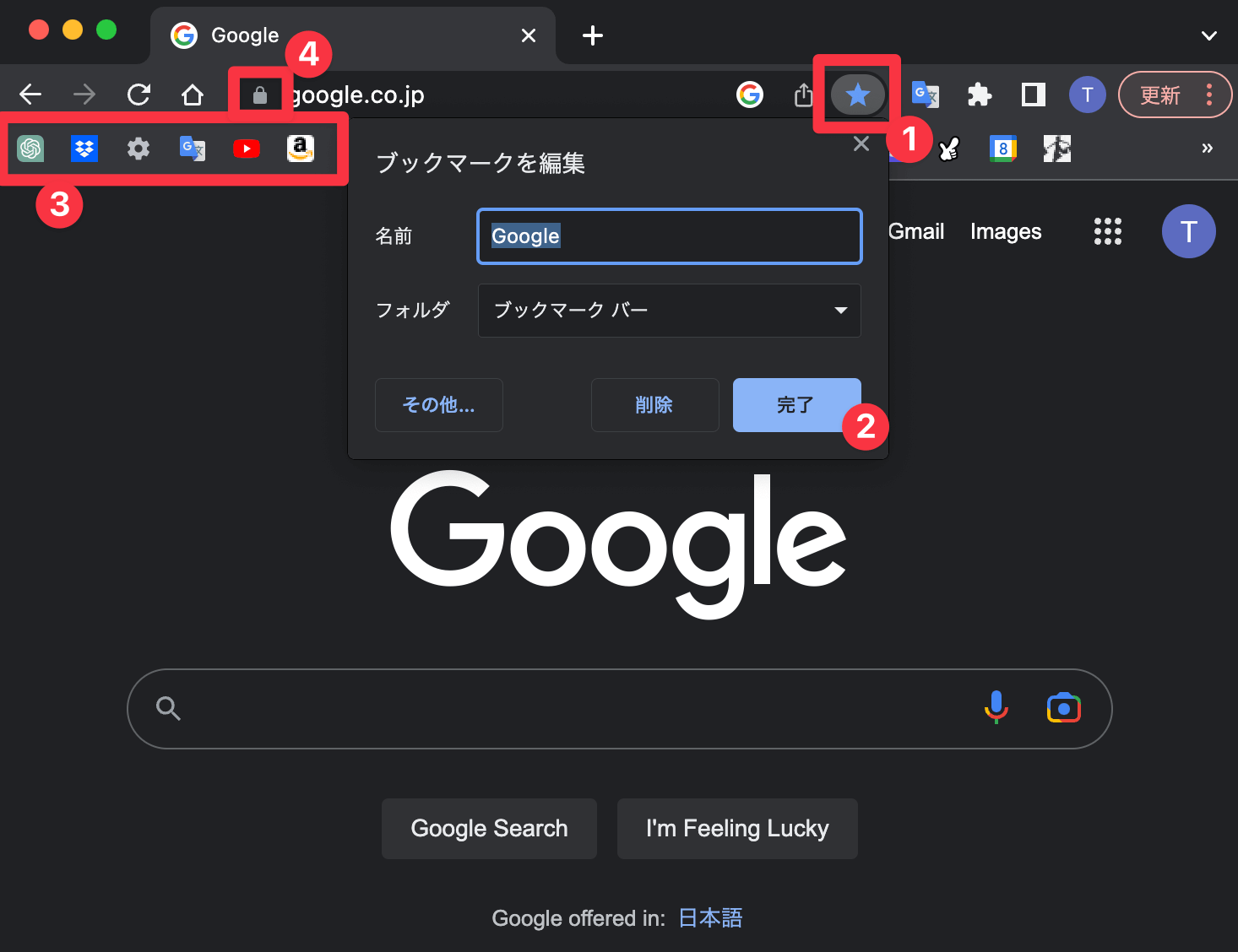 - ブックマークバーにアイコンと名称が表示されます。--赤丸③